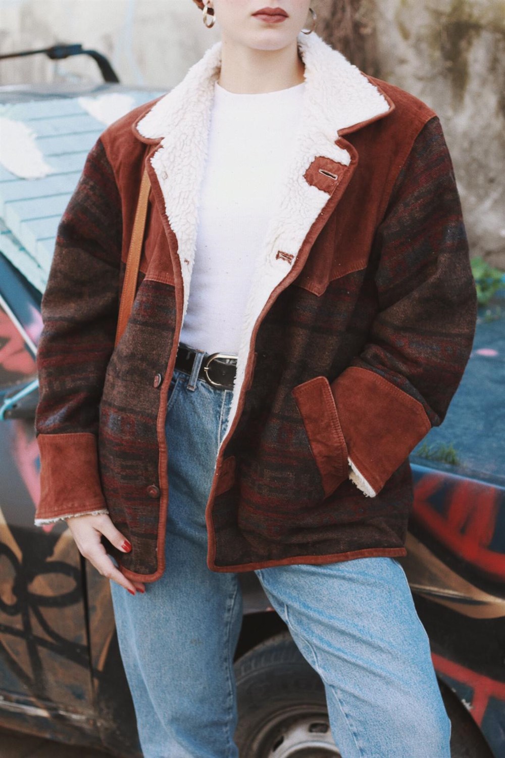 Suede leather&wool fabric, oversize, loose cut, plush furry, Aztec Furry Coat