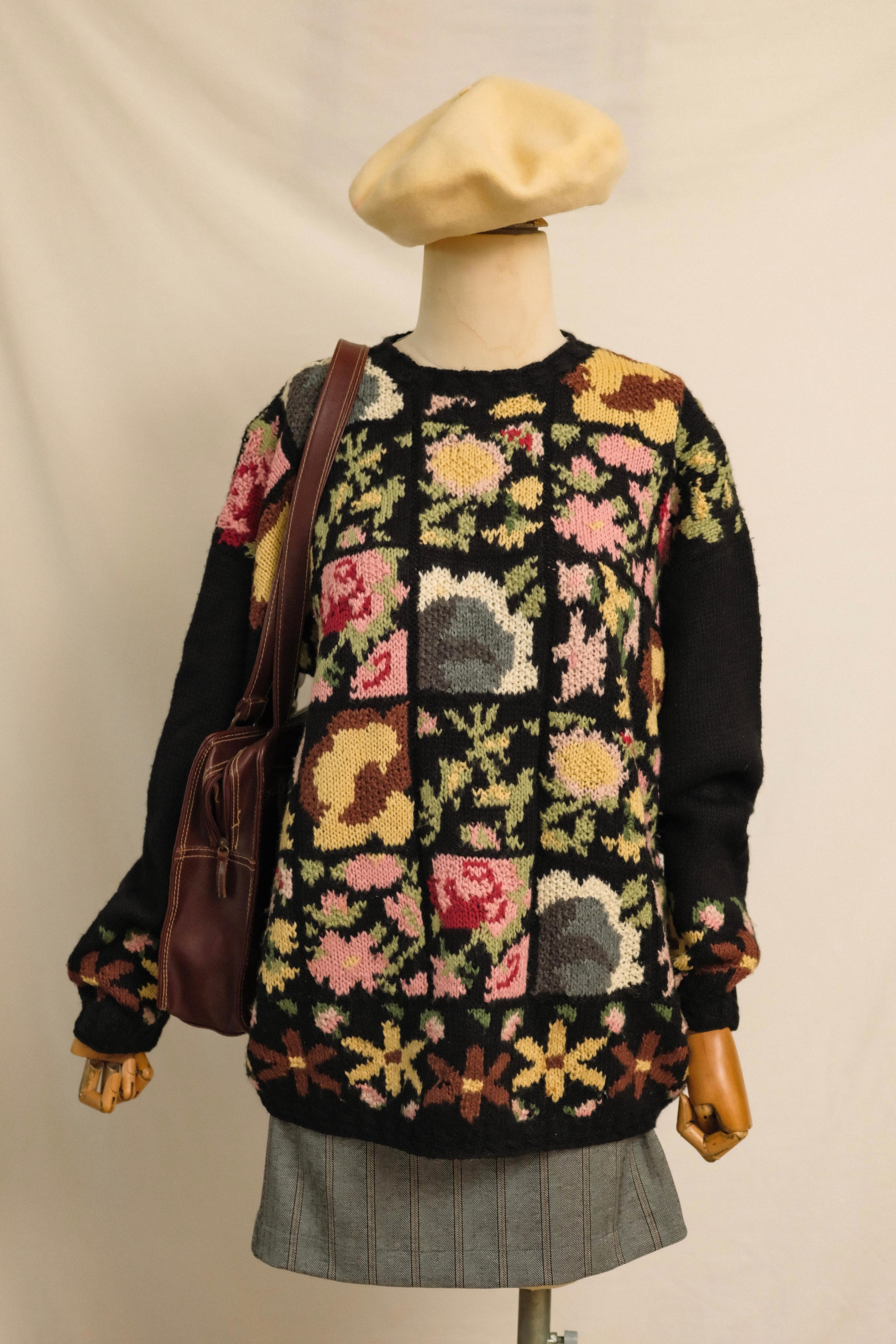 Materyal: %50 Yün – %50 Akrilik Beden: Standart (S–L aralığına uyumlu) Renk: Siyah zemin üzerine çok renkli çiçek desenleri Kondisyon: Çok iyi Dönem: 1980’ler