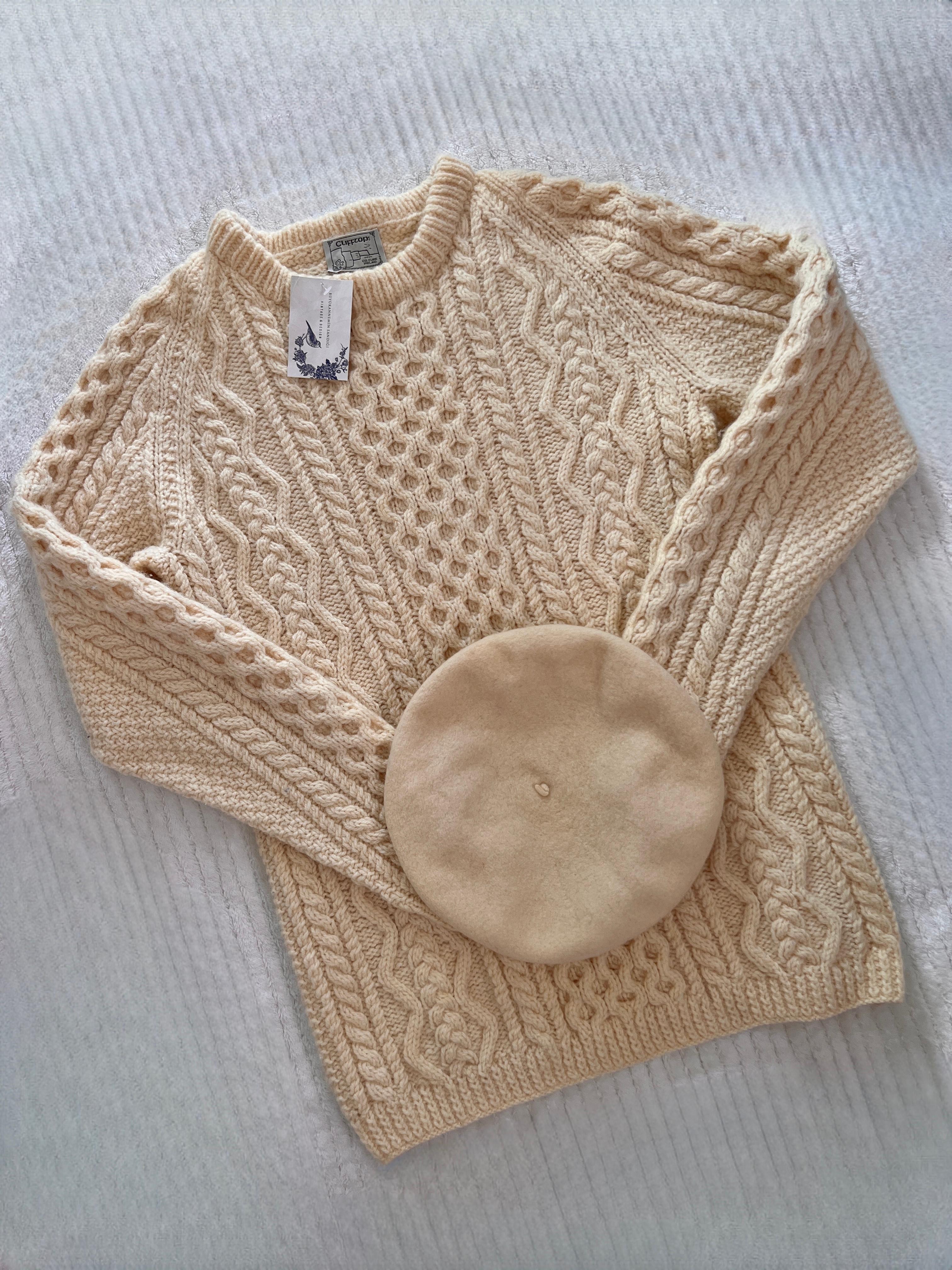 Klasik İrlanda örgü geleneğini yansıtan, zamansız bir vintage parça. Doğal krem tonundaki bu kazak, %100 saf yün içeriği ve kalın dokusuyla soğuk günlerde maksimum sıcaklık sağlar. Yoğun “cable knit” (örgü) deseni, el işçiliği hissiyle birleşerek parçada güçlü bir karakter yaratır.
