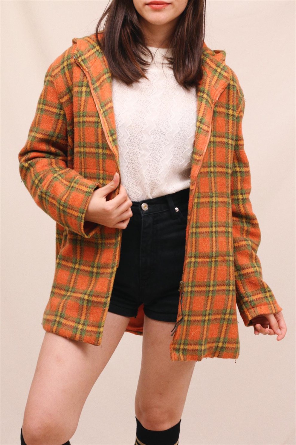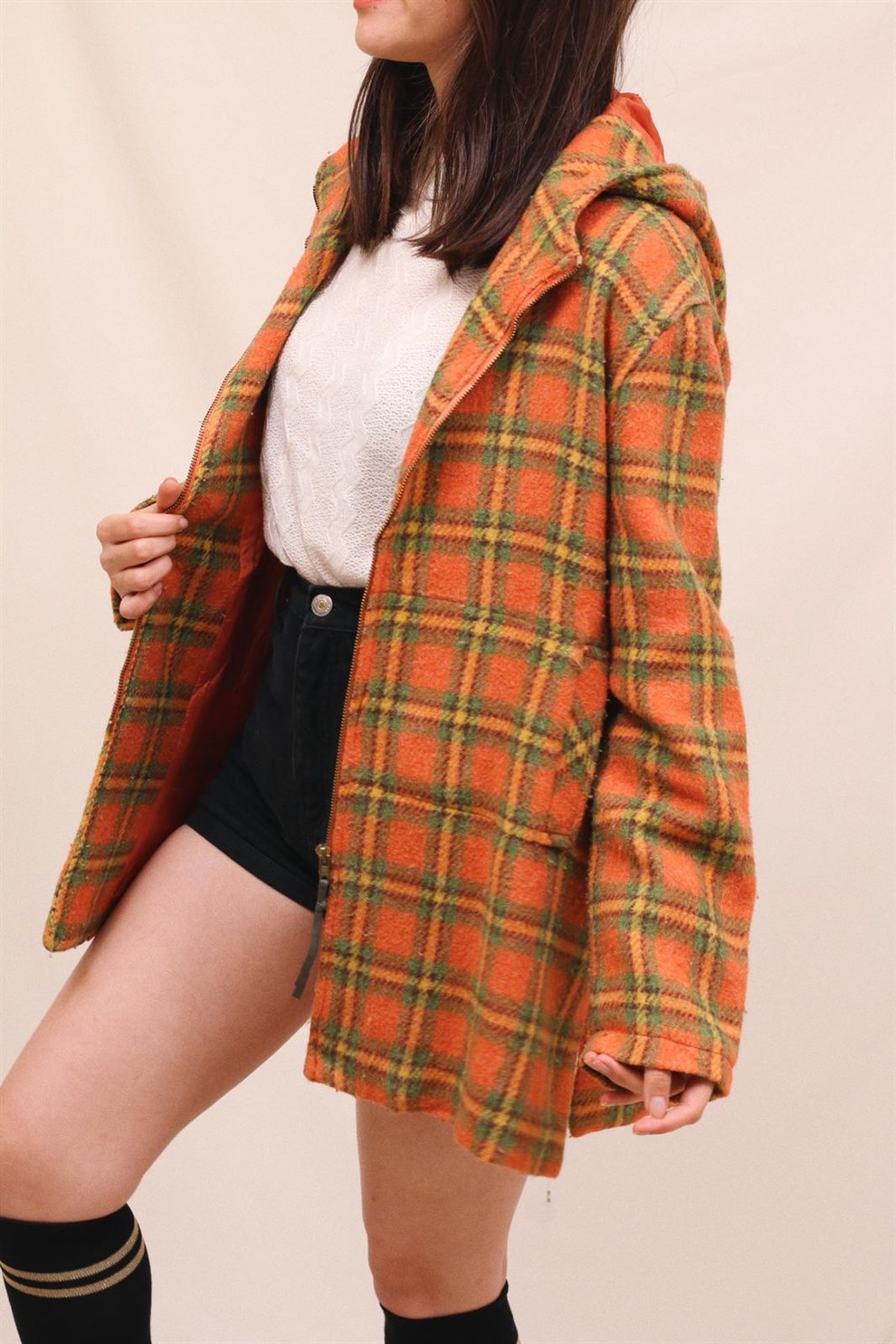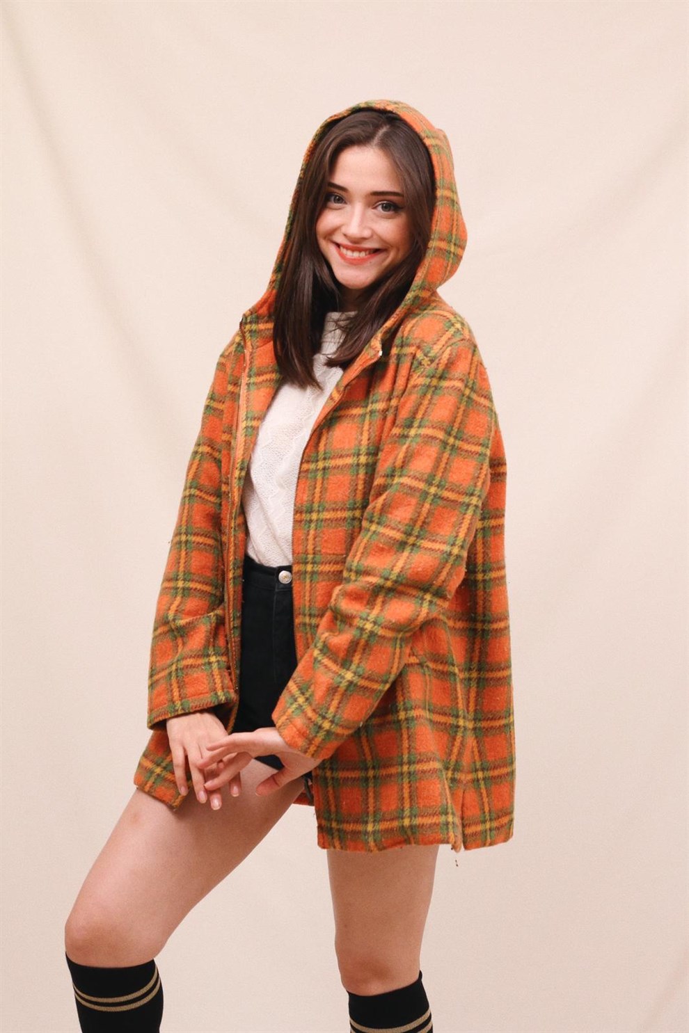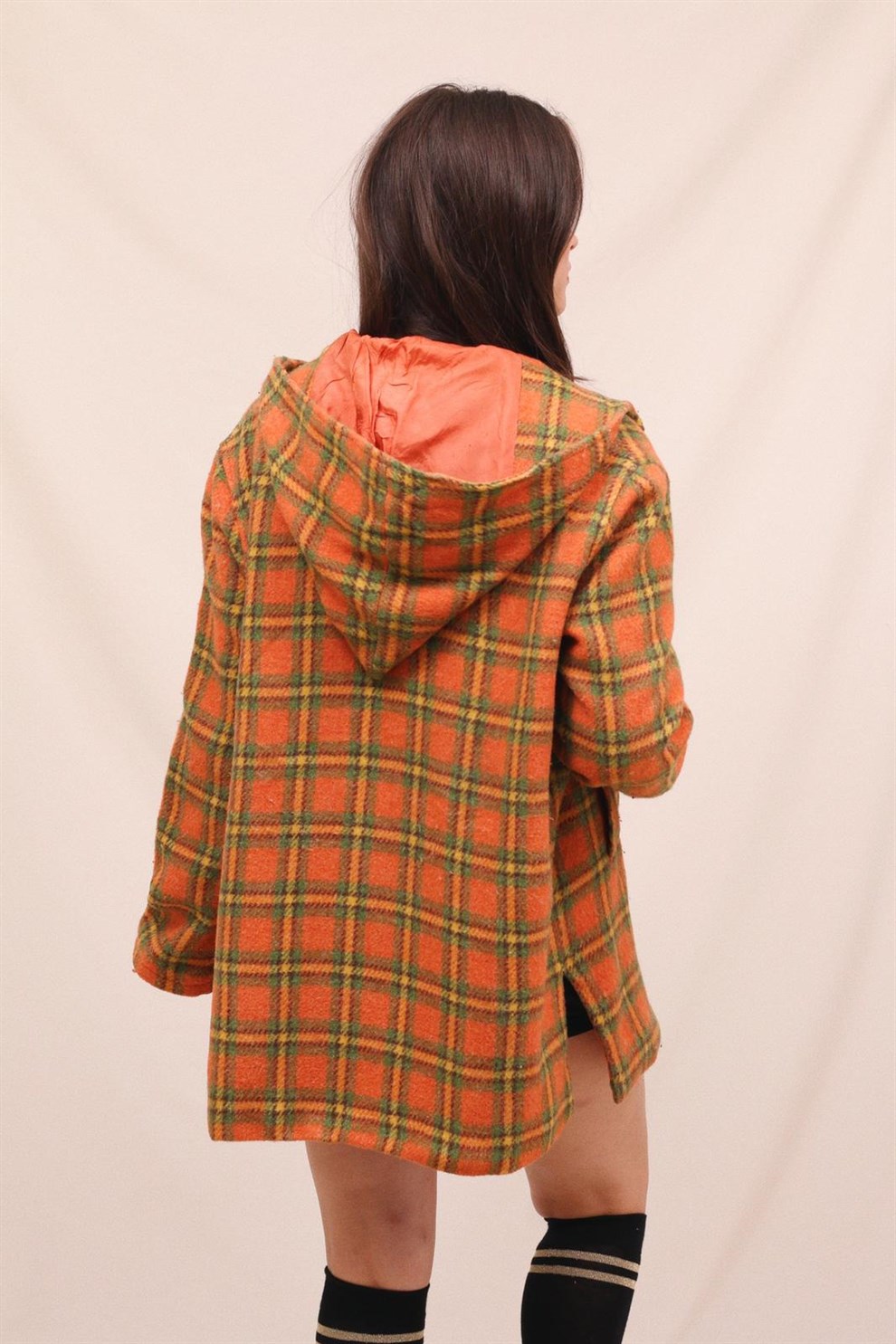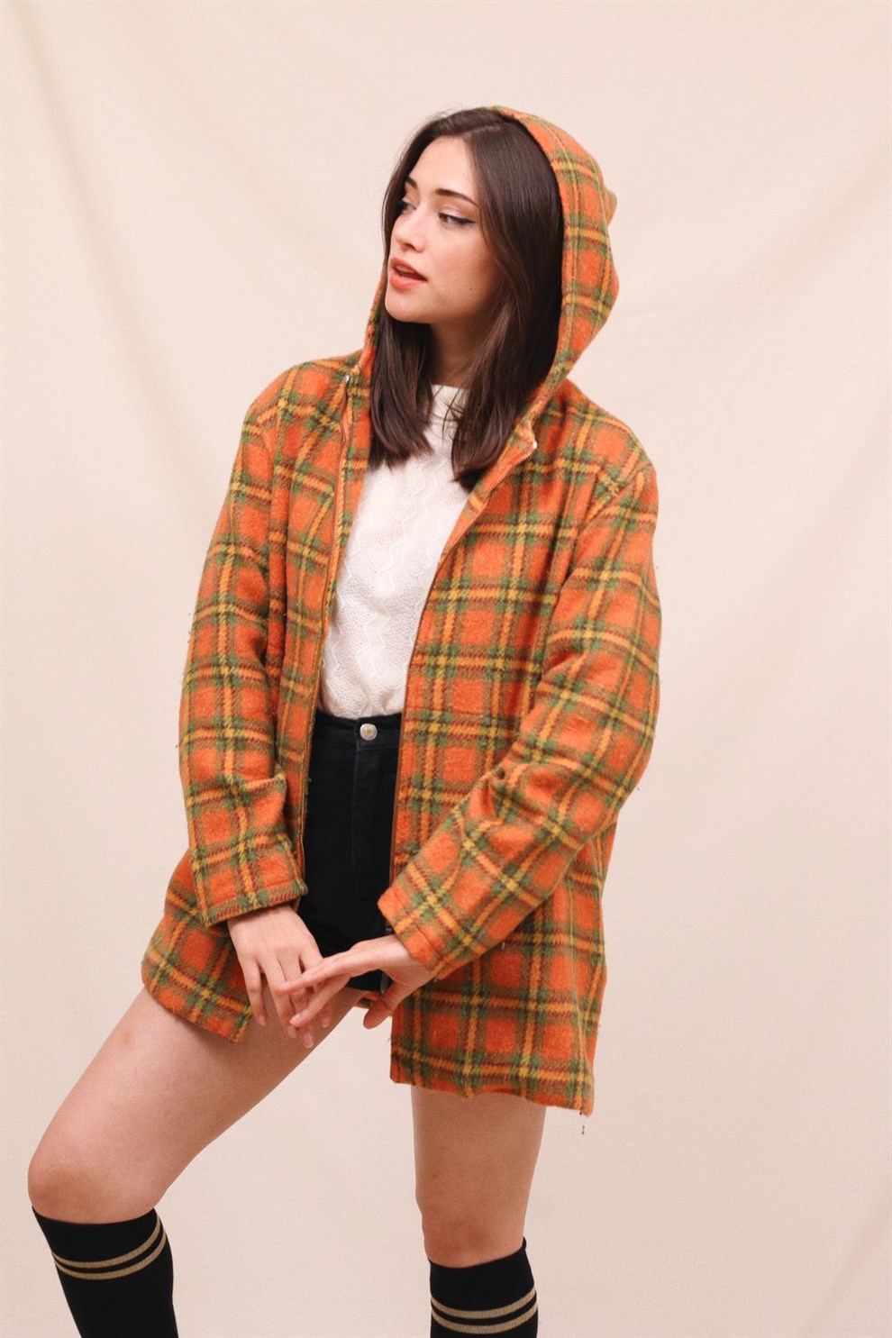Wool-polyester fabric, L size, loose cut hooded flannel coat.