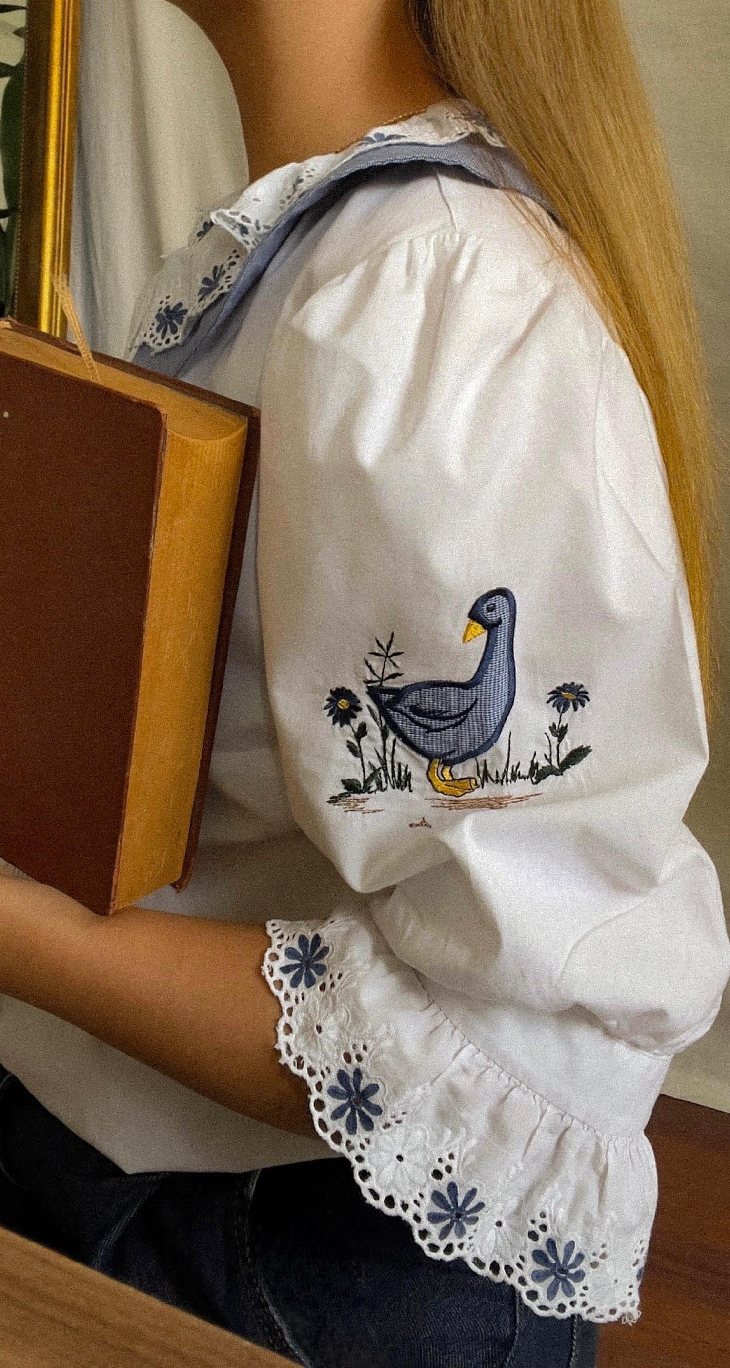 %100 Pamuklu kumaş, Standart beden, (iki koltuk arası mesafe 48 cm), el işçiliğiyle özel olarak tasarlanmış, düğmeleri kaz işlemeli, Lndhaus modasının en zarif örneklerinden biri. Bu düğmeler yalnızca işlevsel değil aynı zamanda nostaljik bir mücevher parçası gibi bluzu süslüyor. Kumaşın saf beyaz tonu ve mavi biyelerle birleşince ortaya hrm zamansız hem de romantik bir stil çıkıyor. Bu koleksiyonluk parça Vintage severlerin dolabının en özel köşesinde yer alacak.