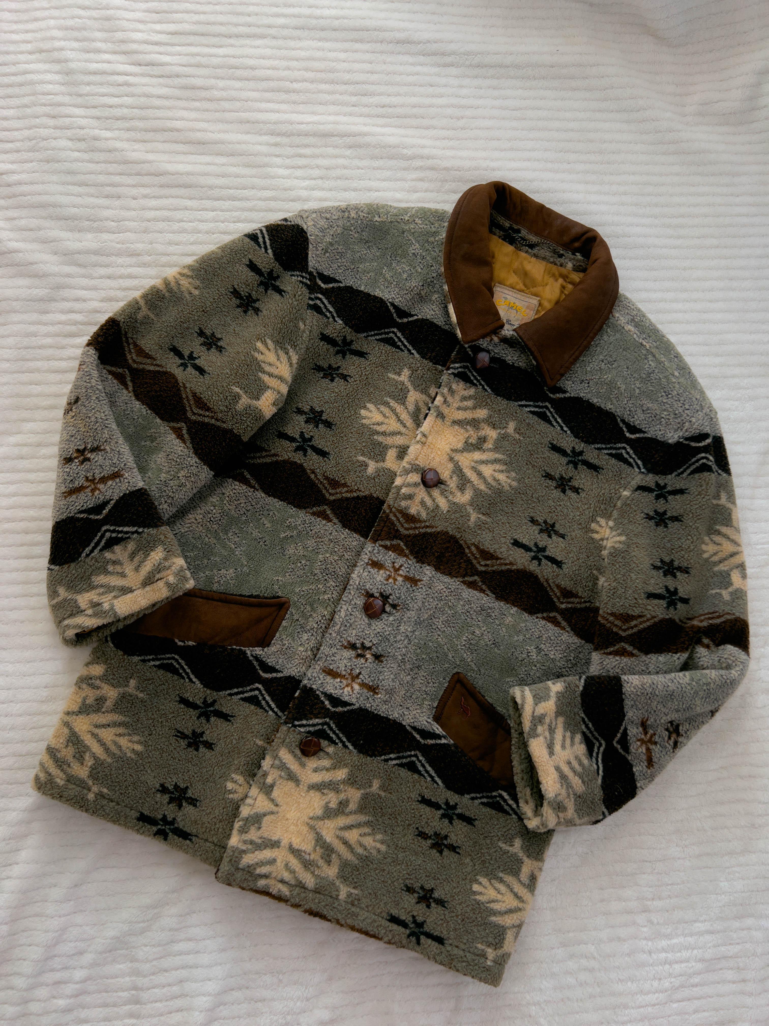 Yumuşak polar dokusu, kahverengi süet yaka detayı ve iç kısmındaki kapitone astarıyla dönemin konforlu ama karakterli dış giyim anlayışını yansıtıyor.