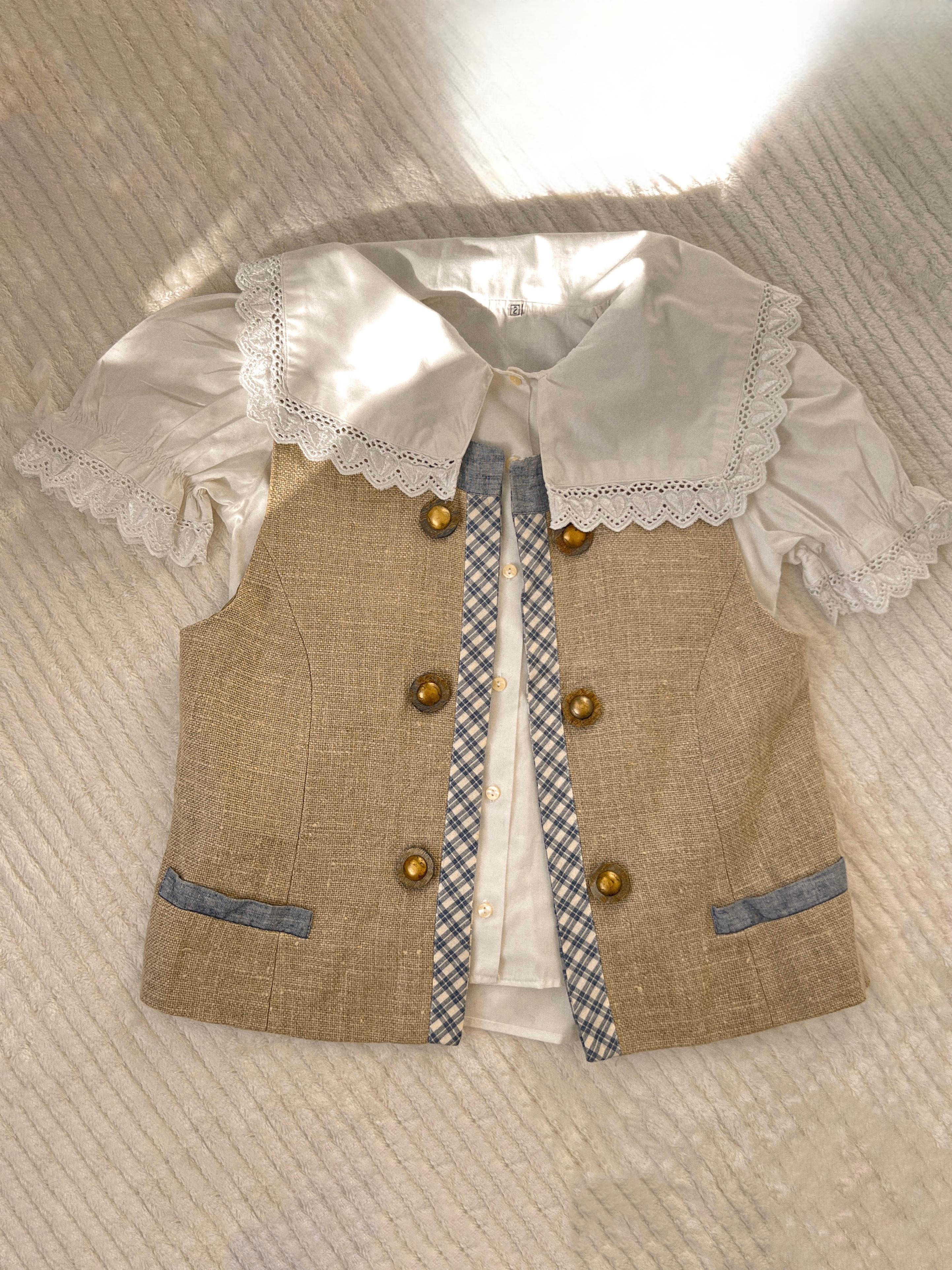 Keten dokulu bej kumaşı, mavi-beyaz kareli pamuk astarı ve antik pirinç tonlu düğmeleriyle geleneksel Tirol estetiğini taşıyor.